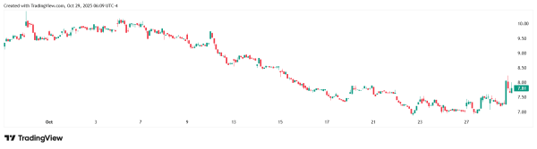 - La valeur nette d'actif (mNAV) de la société est de 0,74 et le cours de l'action est en baisse sur le graphique mensuel.