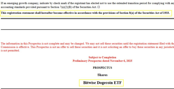 L'analyste ETF de Bloomberg, Eric Balchunas, a déclaré : « Bitwise a déposé une demande d'autorisation 8(a) pour son ETF Dogecoin au comptant, ce qui signifie concrètement qu'il devrait être effectif dans 20 jours, sauf intervention extérieure. » Autrement dit, l'ETF Dogecoin entrera automatiquement en vigueur une fois les documents 8-A et CERT déposés.