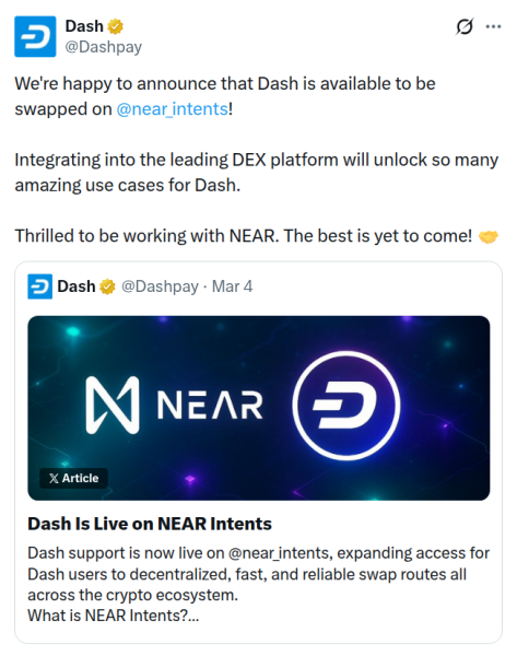 Pour Dash, il ne s'agit pas d'une simple intégration de plus, mais de la poursuite de son engagement à étendre l'accès décentralisé à l'actif. Dans l'annonce officielle, l'équipe lie explicitement ce lancement à l'objectif de rendre Dash plus accessible aux utilisateurs du monde entier grâce à une infrastructure décentralisée. Le protocole Maya a constitué une étape importante dans cette direction, suivi par l'arrivée de DASH sur Aster DEX et Hyperliquid, et maintenant sur $NEAR Intents.