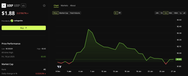 Selon BeInCrypto Markets, le XRP a progressé de plus de 27 % durant les cinq premiers jours de janvier. Toutefois, cette dynamique positive a rapidement laissé place à une tendance baissière. Au cours des dernières 24 heures, le cours a évolué dans une fourchette étroite autour de 1,88 $.