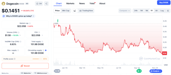 Graphique annuel du DOGE. Source : CoinMarketCap.