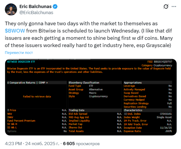 Bitwise lancera un produit concurrent sous le symbole BWOW le 26 novembre. Balchunas a souligné que différents émetteurs ont la possibilité d'être les premiers à commercialiser différentes cryptomonnaies, ce qui contribue au développement du secteur.