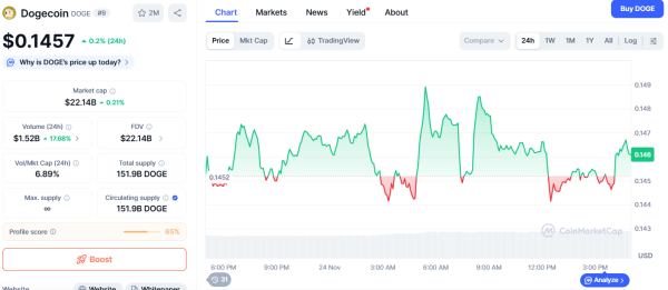 Durant la majeure partie de l'année, le Dogecoin a évolué latéralement entre 0,15 $ et 0,229 $. Pour amorcer un mouvement de prix plus marqué, la cryptomonnaie doit franchir la limite supérieure ou inférieure du canal. Cela pourrait marquer le début d'une tendance haussière ou baissière à part entière, selon la direction de la cassure.