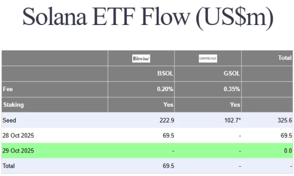 Le 28 octobre, Bitwise a lancé un ETF au comptant sur Solana (BSOL). Le même jour, Canary a listé Litecoin (LTCC) et HBAR (HBR) sur le Nasdaq.