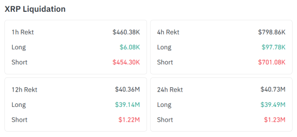 Par ailleurs, les chiffres des dernières 12 heures sont similaires à ceux enregistrés sur le marché au cours des dernières 24 heures. Plus précisément, sur les 12 dernières heures, le montant total des liquidations de XRP s'est élevé à 40,36 millions de dollars, dont 39,14 millions provenaient de positions longues . Cela indique que la majorité des liquidations des dernières 24 heures ont eu lieu au cours des 12 dernières heures.