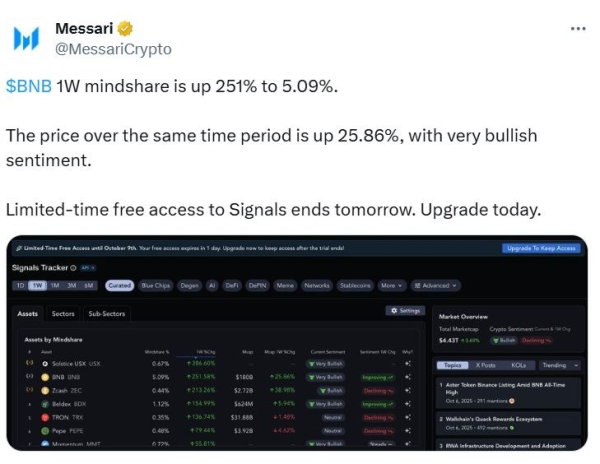 La société d'analyse du marché des crypto-monnaies Messari a rapporté mercredi dans un article que le « niveau d'intérêt » du BNB, une mesure de l'attention, des discussions et de la sensibilisation du public, a augmenté de 251 % pour atteindre 5,09 % au cours des sept derniers jours, l'augmentation des prix étant accompagnée d'un « sentiment très haussier ».
