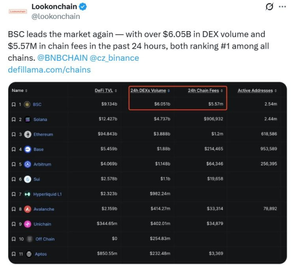 Selon la plateforme d'analyse blockchain Lookonchain, BNB Chain est leader du marché en termes de volume d'échange décentralisé (DEX), avec plus de 6 000 000 000 $ de volume et 5 570 000 $ de frais de réseau.