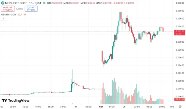 image Le 24 novembre, le réseau principal Monad et le jeton MON ont été lancés. À l'heure actuelle, la capitalisation boursière de la cryptomonnaie s'élève à 365,8 millions de dollars et son prix est d'environ 0,033 dollar. Graphique Bybit MON/USDT en 15 minutes. Source : TradingView.