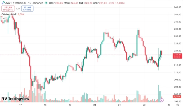 Au moment de la rédaction de cet article, l'AAVE s'échange à 221 $. Au cours des dernières 24 heures, son cours a chuté de 1,8 %.