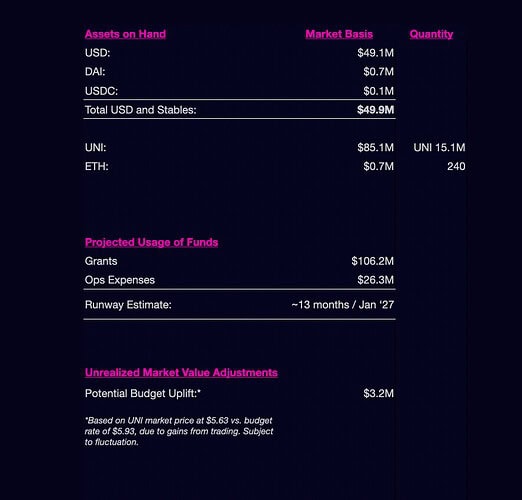 Au 31 décembre 2025, les actifs du fonds s'élevaient à 49,9 millions de dollars en monnaie fiduciaire et stablecoins, 15,1 millions de dollars en UNI et 240 ETH.