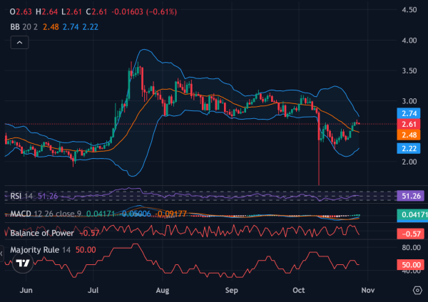 L'indice de force relative (RSI) est à 51,26, et le MACD affiche un faible croisement haussier, l'histogramme atteignant à peine le territoire positif. Cependant, la BoP indique un léger avantage vendeur, et le XRP doit franchir la barre des 2,75 $ pour confirmer un retournement haussier.