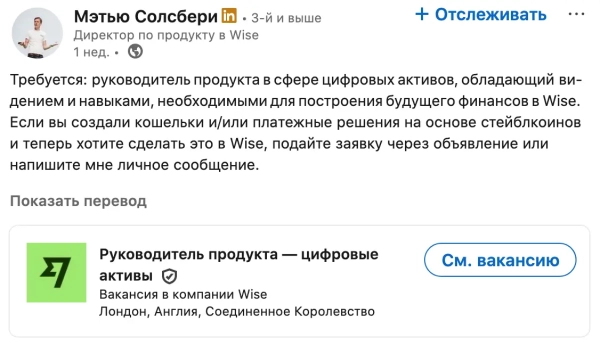 Matthew Salisbury, directeur des produits de Wise, a publié une offre d'emploi sur LinkedIn la semaine dernière. Le poste est à pourvoir au bureau de Londres, où se trouve le siège mondial de Wise.
