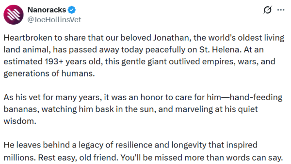 Le 1er avril 2026, un compte sur le réseau social X (Twitter), se faisant passer pour le vétérinaire Joe Hollins, annonça la mort d'une tortue de 193 ans nommée Jonathan. L'information s'avéra fausse, mais la cryptomonnaie JONATHAN, émise par le réseau Solana, connut tout de même une flambée spectaculaire, de plus de 1 400 % à l'époque, selon DEX Screener.