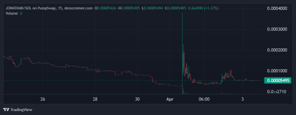 Suite à l'importante médiatisation de l'événement, le memecoin JONATHAN du réseau Solana a connu une flambée de prix. Son cours a brièvement atteint un nouveau record historique de 0,00038 $, soit une hausse de plus de 1 400 %, avant de refluer.