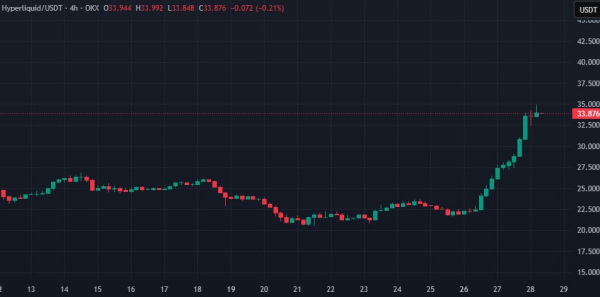 Le prix du token Hyperliquid ( $HYPE ) a progressé de plus de 50 % ces trois derniers jours. L'actif a gagné environ 60 % la semaine dernière. Au moment de la publication, $HYPE s'échange à plus de 34 $.