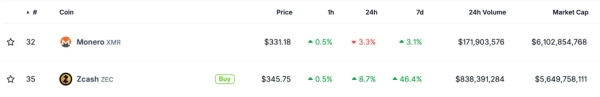 Le taux de croissance de Zcash dépasse largement celui du leader du secteur, Monero. À titre de comparaison, le prix du XMR a chuté de 3,6 % au cours des dernières 24 heures et n'a progressé que de 3 % la semaine dernière.