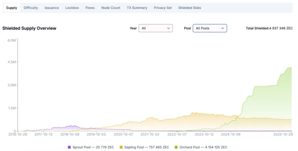 Chaque nouvelle génération a constitué son propre pool sécurisé tout en conservant une compatibilité totale avec les générations précédentes. À l'heure actuelle, Orchard est le plus important, avec 4,1 millions de ZEC.