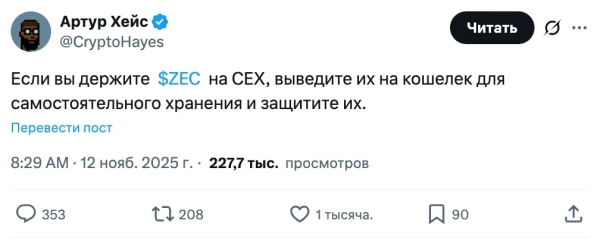 Mercredi, Hayes a exhorté les détenteurs de Zcash à transférer leurs jetons des plateformes d'échange centralisées vers des portefeuilles de stockage autonome, suggérant aux utilisateurs de X de « sécuriser » leurs actifs pour les transactions privées.