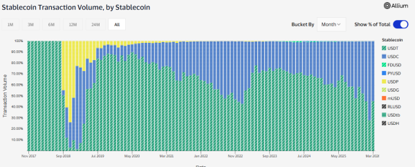 En termes de volume et de nombre de transactions , l'USDT et l'USDC sont quasiment sans égal. À titre de comparaison, le stablecoin PYUSD du géant des paiements PayPal représente environ 0,2 % du volume de transactions et environ 0,1 % du total des transactions.