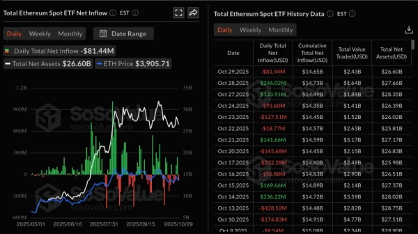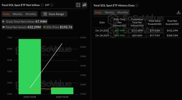 Les ETF au comptant basés sur Solana ont attiré 47,9 millions de dollars d'entrées de capitaux le 29 octobre. Depuis le lancement de cet instrument, les entrées de capitaux ont dépassé 117 millions de dollars.