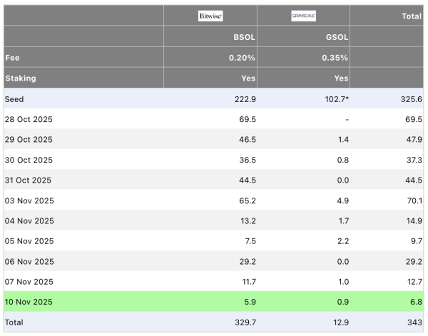 Le 10 novembre, l'ETF Solana Spot a attiré 6,78 millions de dollars d'investissements nets. Le fonds BSOL de Bitwise a capté la part du lion de ces entrées de capitaux, avec 5,92 millions de dollars. Le deuxième acteur du marché, le fonds GSOL de Grayscale, a quant à lui reçu un montant plus modeste de 854 480 dollars.