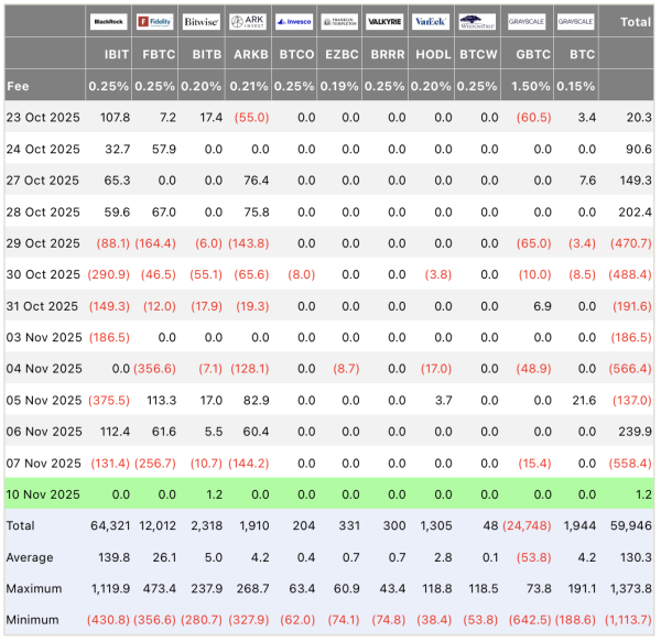 Le 10 novembre, les ETF Bitcoin au comptant ont enregistré une entrée nette modeste de 1,15 million de dollars, intégralement investie dans le fonds Bitwise. Les ETF Ethereum ont clôturé la journée sans entrée nette.