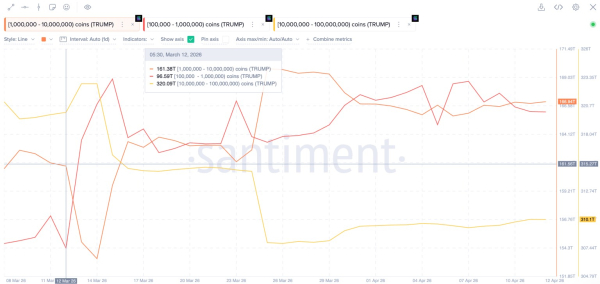 Les données de la blockchain Santiment montrent une nette redistribution des tokens suite à l'annonce de l'événement le 12 mars. Les plus gros détenteurs, possédant entre 10 et 100 millions de tokens , ont initialement réduit leurs avoirs. Leur volume est passé de 320,09 billions à 307,95 billions à la fin du mois de mars.