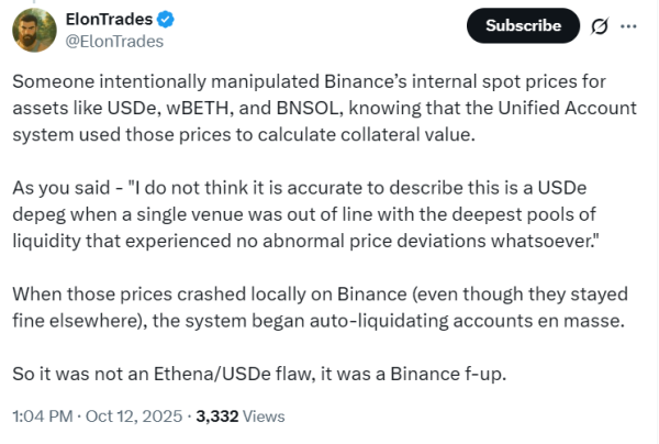 Pendant ce temps, d'autres analystes se demandaient s'il s'agissait d'une manipulation concertée ou d'un problème technique. Un analyste d'ElonTrades pense que quelqu'un a intentionnellement utilisé les flux de prix internes de Binance, sachant que le système utilise ces prix pour calculer la valeur des garanties.