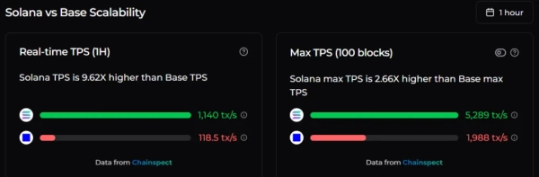 Solana surpasse largement Base en termes de scalabilité. Son débit actuel est de 1 140 transactions par seconde (TPS), soit près de 10 fois celui de Base (118,5 TPS). Le débit maximal historique de Solana a atteint 5 289 TPS, contre 1 988 TPS pour son concurrent. Le débit maximal théorique de Solana est de 65 000 transactions, contre 3 571 pour le réseau de couche 2.