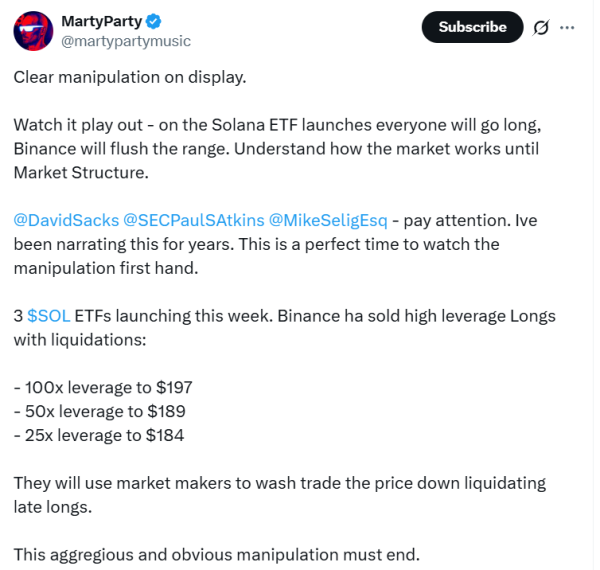 « Ils lancent un ETF Solana cette semaine. Binance a déjà liquidé des positions longues à fort effet de levier : 100x à 197 $, 50x à 189 $ et 25x à 184 $. Les teneurs de marché utiliseront des opérations fictives pour faire baisser le prix et liquider les positions longues tardives », affirme l'auteur du message.