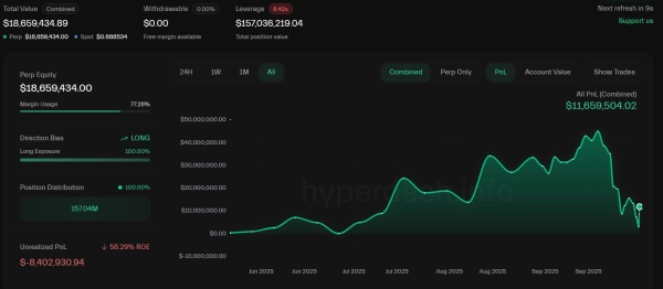 La célébrité musicale taïwanaise et célèbre investisseur en actifs numériques Jeffrey Huang, également connu sous le nom de Machi Big Brother, est confronté à une perte non réalisée de près de 9 millions de dollars sur son compte Hyperliquid.