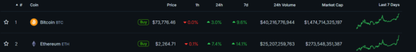 Au moment de la rédaction de cet article, le fleuron du marché des cryptomonnaies s'échange à 73 546 dollars, et Ethereum à 2 253 dollars.