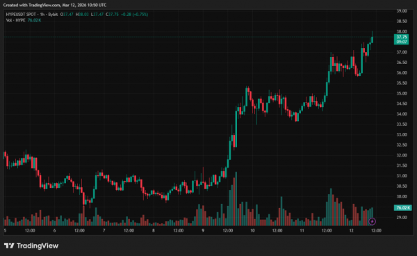 Hyperliquid est devenu un véritable terminal de guerre fonctionnant 24h/24 et 7j/7. La plateforme s'impose comme le principal lieu d'échange de « trading macro-risque » continu, ce qui fait grimper le prix de son jeton natif, HYPE. Au cours des dernières 24 heures seulement, le prix de la cryptomonnaie a bondi de 10 % pour atteindre 37,7 $.
