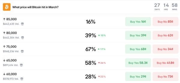 Les utilisateurs de la plateforme de prévision Polymarket sont désormais optimistes. La probabilité d'atteindre 80 000 $ en mars est passée de 20 % à 39 % en une seule journée.