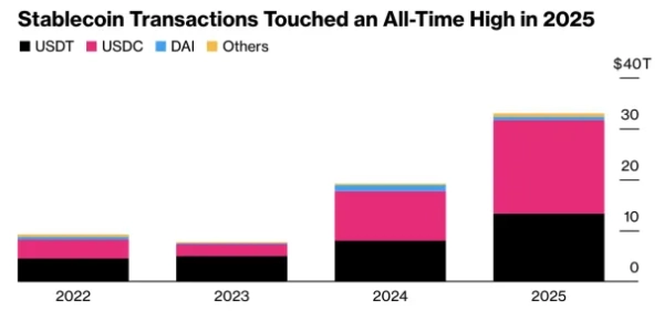 Le volume total des transactions en « stablecoins » a augmenté de 72 % en 2025 pour atteindre 33 billions de dollars.