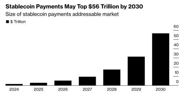 Selon les analystes de Bloomberg Intelligence, le volume total du segment des stablecoins pourrait atteindre 56 billions de dollars d'ici 2030.
