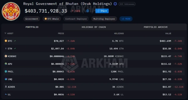 Les autorités bhoutanaises ont retiré 284,8 bitcoins, soit l'équivalent de 22,3 millions de dollars, des réserves de l'État. Cette information a été révélée par la plateforme d'analyse Arkham.