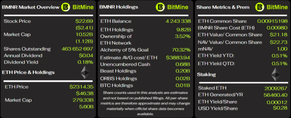 La baisse des cours a affecté le ratio mNAV . Chez BitMine, il est tombé à 1, et chez SharpLink, à 0,92.