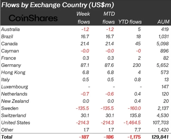 Les investisseurs allemands ont investi 87,1 millions de dollars dans des fonds de cryptomonnaies, et les Suisses 30,1 millions de dollars. Des entrées de capitaux ont également été enregistrées au Canada (21,4 millions de dollars) et au Brésil (16,7 millions de dollars).