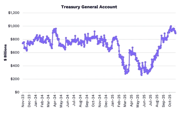 Le compte du Trésor reste à un niveau élevé de 892 milliards de dollars, contre un niveau normalisé d'environ 600 milliards de dollars.