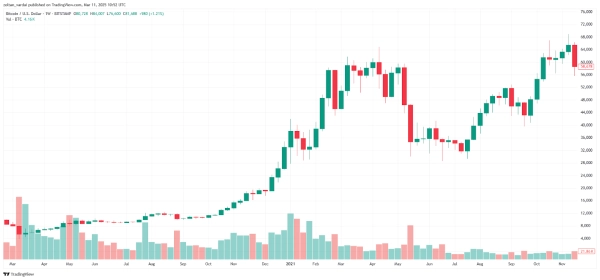 Graphique hebdomadaire BTC/USD, 2020-2021. Source : TradingView