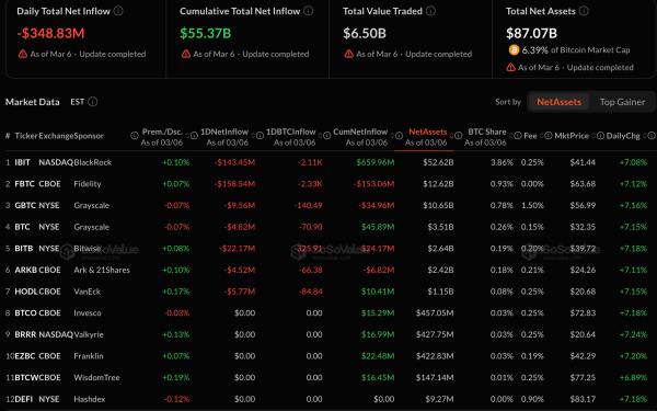 Le total des actifs sous gestion (AUM) des ETF Bitcoin au comptant s'élève à 87 milliards de dollars. Source : SoSoValue.