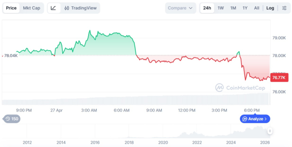 Au moment de la publication, le Bitcoin était tombé sous la barre des 77 000 $, tandis que l’Ethereum était passé sous les 2 300 $ dans un contexte d’optimisme à court terme en berne, selon CoinMarketCap.