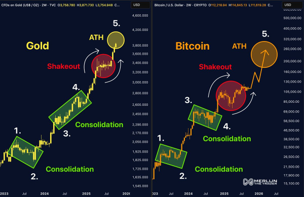 Le trader Merlijn a déclaré que le Bitcoin « suivait toujours le modèle de l'or ». « Or : une accélération avant un record historique. Bitcoin : même consolidation, même piège. La cassure est préprogrammée. Prochain arrêt : mode de découverte du prix juste », a-t-il écrit sur les réseaux sociaux.