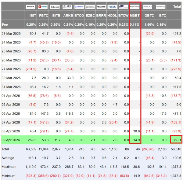 Selon Farside, les ETF au comptant ont enregistré des entrées nettes de 358,17 millions de dollars, inversant la tendance baissière de la veille. Le fonds de Morgan Stanley (MBST), après avoir fait ses débuts avec 34 millions de dollars d'actifs sous gestion, a attiré un montant modeste de 14,9 millions de dollars lors de sa deuxième journée.