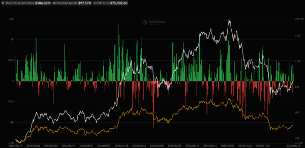 Les entrées de capitaux dans les ETF $BTC au comptant ont atteint 186 millions de dollars, contre 411,5 millions de dollars la veille.