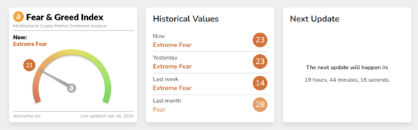L'indice de peur et d'avidité est resté à 23 points, conservant sa position dans la zone de peur extrême.