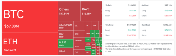 Selon Coinglass, les liquidations de positions courtes sur Bitcoin ont totalisé 48,7 millions de dollars au cours des dernières 24 heures, soit plus du double du montant des liquidations de positions longues (20,4 millions de dollars).
