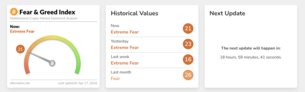 L'indice de peur et d'avidité est passé de 23 à 21 points, restant dans la zone de peur extrême.