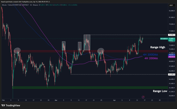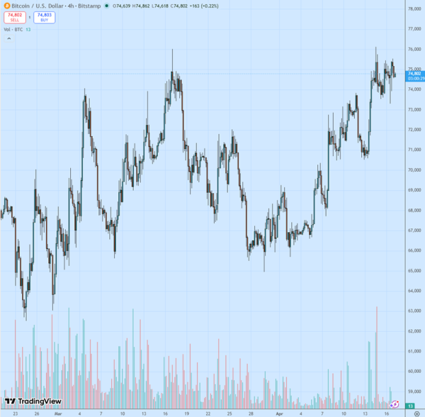 Le 16 avril, le Bitcoin ( BTC ) a tenté de franchir la barre des 75 000 $ en testant ses limites. Une tentative de correction, avec une cassure à la baisse sous les 73 600-73 800 $, a échoué face à une forte résistance des acheteurs. Le prix n'a pas encore réussi à se consolider au-dessus des 75 000 $. Vendredi matin, il est repassé sous ce seuil psychologique.
